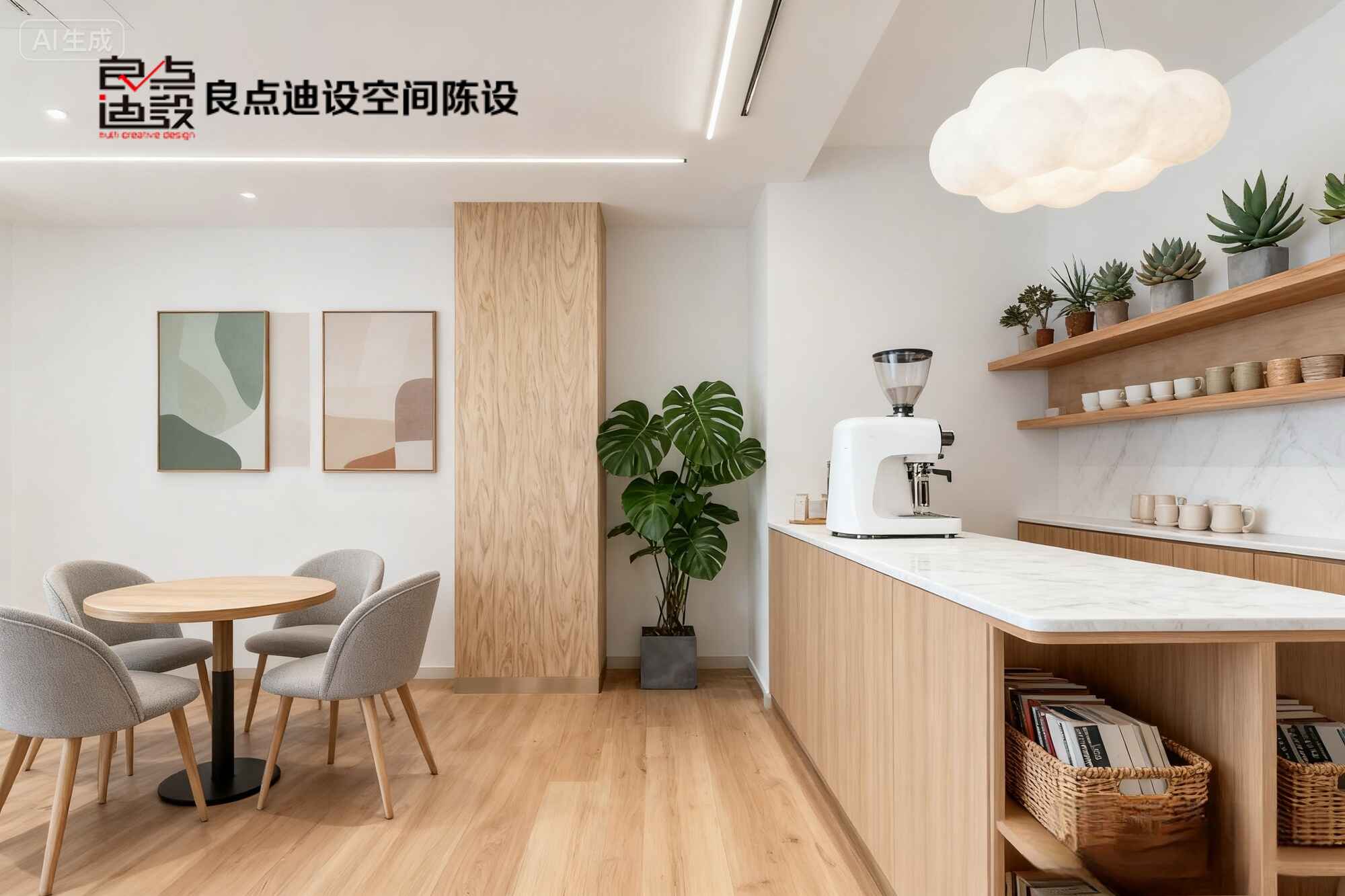 燈光更是心機滿分!木質格子天井嵌了暖光燈帶,光線透過宣紙燈罩柔得像自帶濾鏡。墻上留白畫框和角落苔蘚盆栽里的蕨葉,瞬間把自然感拉滿。整體木色+米白+淺咖的配色,治愈又不失高級,手機原相機直出都能火!