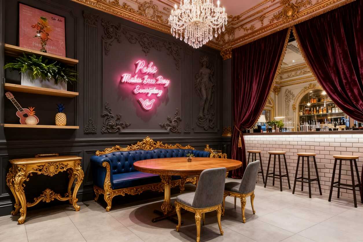 ***吸睛的***是左側(cè)那面彩色墻繪!在水泥灰的主色調(diào)里突然跳出這么一抹亮色,整個(gè)空間瞬間就活了起來。右手邊那面紅墻更是絕絕子,配上霓虹燈的柔和光暈,氛圍感直接拉滿。這種冷暖色調(diào)的碰撞,設(shè)計(jì)師真是玩明白了!