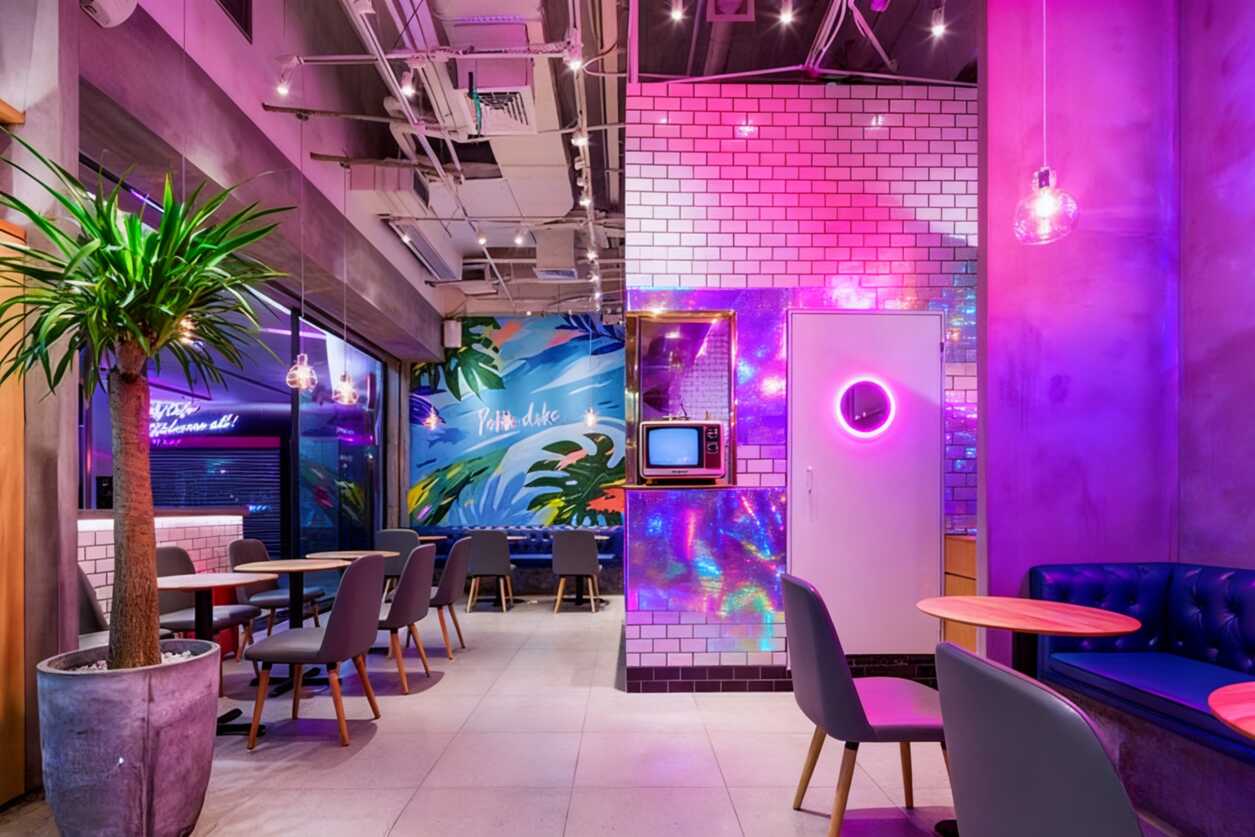 細(xì)節(jié)處更是藏著不少驚喜!暖色吊燈的光線溫柔地灑下來,食物拍出來都帶著濾鏡感。粉色燈光墻前擺著綠植,隨手一拍就是ins風(fēng)大片。墻上的"Panda""Wild"這些金屬字裝飾,給空間增添了不少趣味性。