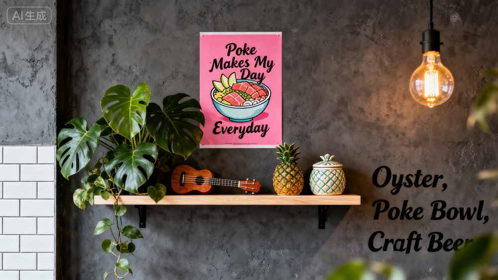 暖黃燈泡***是點(diǎn)睛之筆!光線打在水泥墻上泛出淡淡光暈,連工業(yè)風(fēng)的冷峻都變得溫柔起來。"Oyster, Poke Bowl, Craft Beer"的標(biāo)語用***直接的方式宣告店家特色,這種不拐彎抹角的個(gè)性反而很拉好感。
