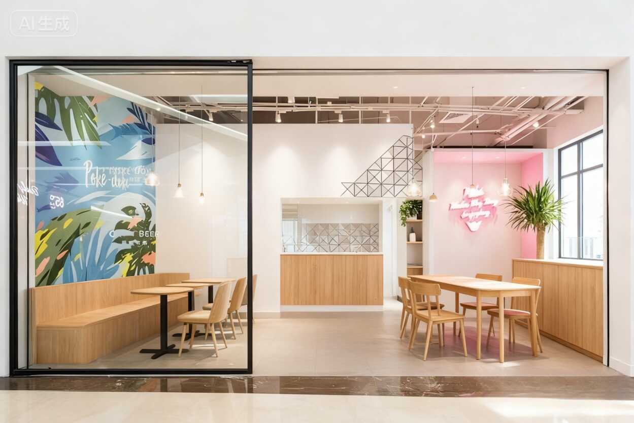 寶子們!今天要安利這家讓我一進(jìn)門就瘋狂拍照的"Pake-while"餐廳!通透的玻璃隔斷上印著色彩鮮艷的熱帶植物圖案,搭配粉色墻面和霓虹燈牌,這波操作直接封神!