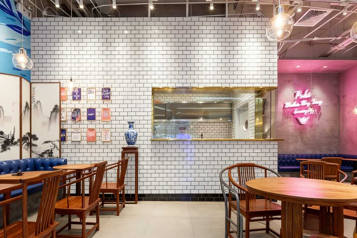 ***絕的是中間這個(gè)過渡處理!白色瓷磚墻打底,透明玻璃櫥窗讓后廚若隱若現(xiàn),既保留了空間通透感又增添了些許神秘。墻上那組彩色裝飾畫***是點(diǎn)睛之筆,藍(lán)白花瓶帶著青花瓷的韻味,現(xiàn)代感和傳統(tǒng)元素碰撞得恰到好處。