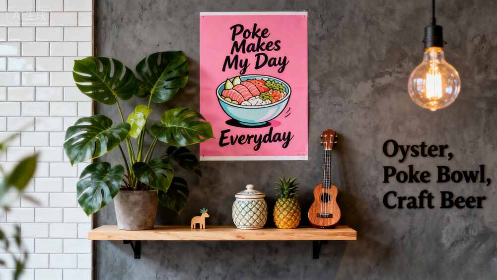 ?? 這家Poke店軟裝設計太會了!灰墻木架+治愈粉海報,進去就不想走!