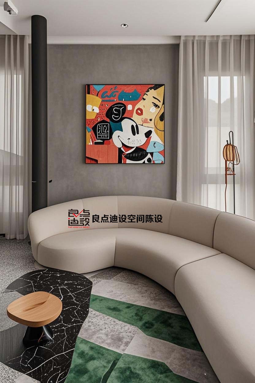 再來(lái)說(shuō)說(shuō)搭配的弧形沙發(fā)。它就像一個(gè)溫柔的懷抱,給人滿滿的安全感。柔和的線條和硬朗的墻面、柱子形成了鮮明的對(duì)比,在視覺(jué)上產(chǎn)生了強(qiáng)烈的沖擊力。坐上去,柔軟的質(zhì)感包裹著身體,讓人瞬間放松下來(lái)。而且弧形的設(shè)計(jì)還增加了空間的流動(dòng)感,讓客廳看起來(lái)更加寬敞。想象一下,在忙碌了一天之后,回到家躺在這舒適的沙發(fā)上,看著墻上的畫(huà),所有的疲憊都煙消云散了。