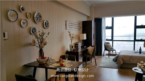 此空間為東茂國際酒店式公寓樣板間項(xiàng)目,整體空間運(yùn)用現(xiàn)代簡(jiǎn)潔的線條,融入中國風(fēng)元素,具有古典傳承又有時(shí)尚現(xiàn)代之風(fēng)。色彩上運(yùn)用高級(jí)灰,象牙白搭配高貴淡雅黃,讓空間亮麗又不失典雅。頂部搭配線條簡(jiǎn)潔的新中式風(fēng)格燈具,再點(diǎn)綴山水寫意的掛畫使空間多一份雅致,客廳配飾具有優(yōu)雅造型的釣魚燈,使空間意境幽遠(yuǎn),穩(wěn)重中透出活潑,餐區(qū)墻面點(diǎn)綴精致的藍(lán)色金色搭配的裝飾瓷盤體現(xiàn)出居者生活品味,書桌上放懸掛隸書條幅文化涵養(yǎng),透出安然之態(tài),在這樣的空間之中定能感覺到中華之美。