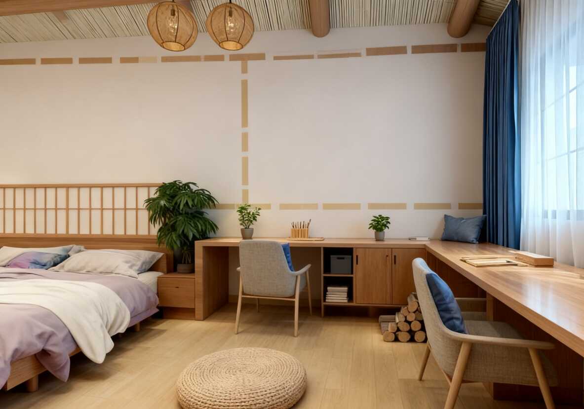 家具選擇:所有的家具都是原木材質(zhì)的哦,淺木色的書(shū)桌、床頭柜、椅子,質(zhì)感溫潤(rùn)又自然,和整個(gè)空間的風(fēng)格***融合~那個(gè)編織的小蒲團(tuán)也超有氛圍感,往地上一放,瞬間就有了日式居酒屋那種慵懶放松的感覺(jué),坐上去晃晃腳丫,超愜意~