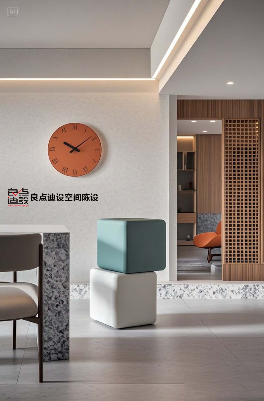 客廳實(shí)木隔段巧妙地解決了空間劃分的作用,同時(shí),讓兩個(gè)區(qū)域之間不失互動(dòng);客廳區(qū)的收納懸掛柜以實(shí)用與幾何美學(xué)為空間帶來(lái)趣味,黃色漆的點(diǎn)綴,跳動(dòng)著生機(jī)與活力。