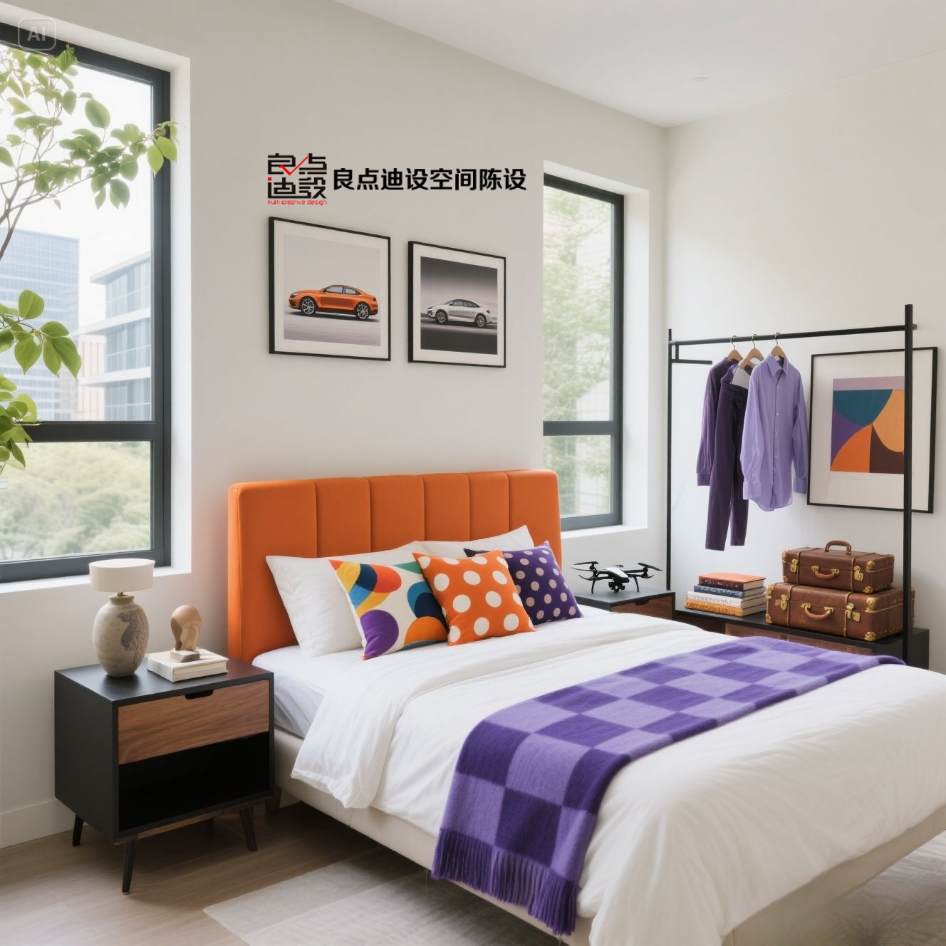 配色公式直接抄: 大面積白墻 + 一個(gè)亮色(橘、黃、粉都行)做主角(像床頭)+ 一個(gè)灰調(diào)輔助色(紫、綠、藍(lán))做點(diǎn)綴(毯子/抱枕/窗簾)。記住 70%主色 + 20%輔助色 + 10%跳色點(diǎn)綴,穩(wěn)!