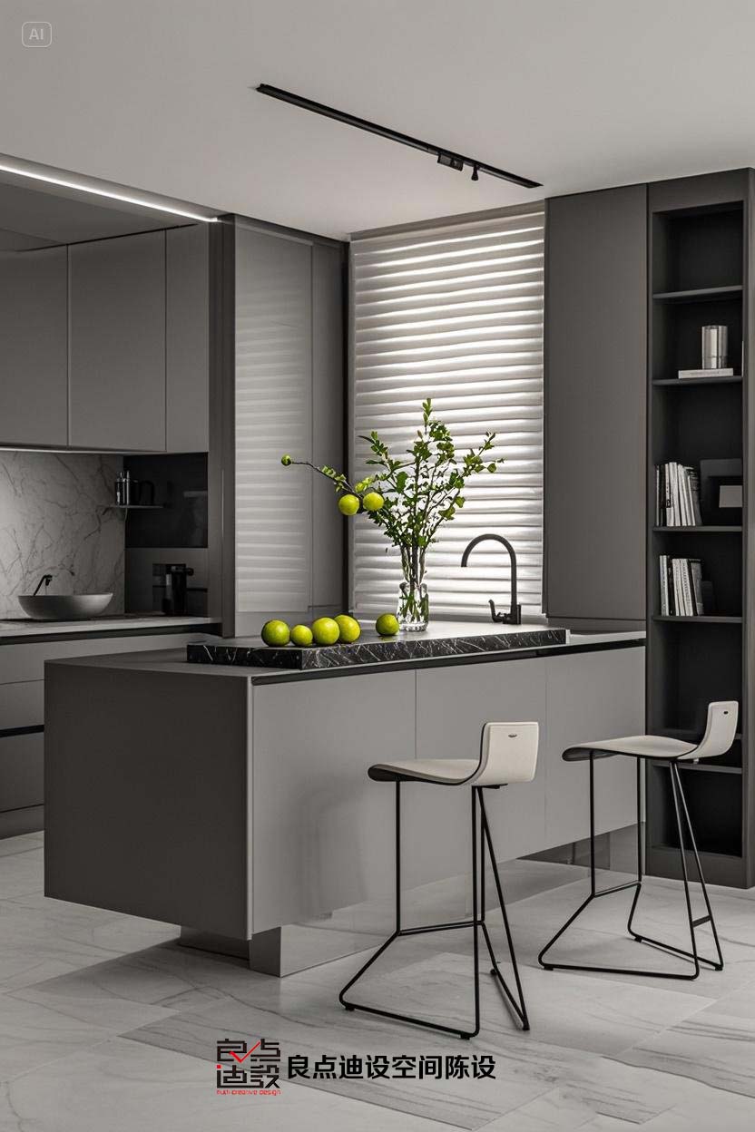 就看看圖里這個廚房,整體是那種低飽和度的灰色調(diào),沉穩(wěn)又大氣。櫥柜的設(shè)計走的是極簡風(fēng),沒有多余的裝飾線條,表面光滑得不得了,打理起來那叫一個輕松。開放式的吊柜很有設(shè)計感,放一些常用的餐具或者好看的擺件,瞬間提升了廚房的顏值和氛圍感。
